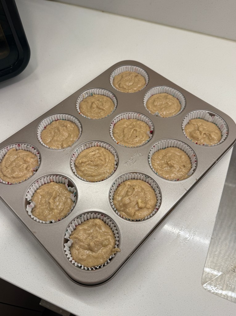 - Divide the batter evenly among the muffin cups, filling each about 3/4 full.